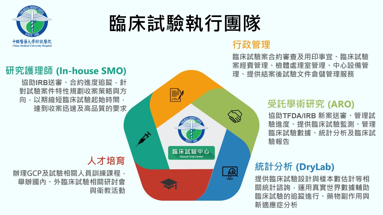 本院於2010年創立「臨床試驗中心」(Clinical Trial Center, CTC),提供執行臨床試驗所需各項服務之機制,依業務性質分為五個不同功能,組成互相支援之團隊,包含行政管理組、研究護理師組、人才培育與教育訓練組、受託學術試驗組及大數據分析組。行政管理組主要任務是提供臨床試驗整合服務、管理與執行臨床試驗,為了加速臨床試驗起始期程,臨床試驗中心審查臨床試驗合約時接受全英文內容,且合約可與研究倫理委員會及衛生福利部食品藥物管理署平行送審,促使試驗及早進行。臨床試驗中心設有專職研究護理師提供臨床試驗收案所需之各項服務,協助試驗過程運作協調,給予受試者最即時完善且專業的照顧。此外,為了提升試驗執行能力與知識,人才培育與教育訓練組定期舉辦國內外臨床試驗相關活動,並邀請臨床試驗領域產官學界專家提供專業之實體與線上訓練課程,不間斷汲取新知與國際接軌,全面提升台灣的競爭力。