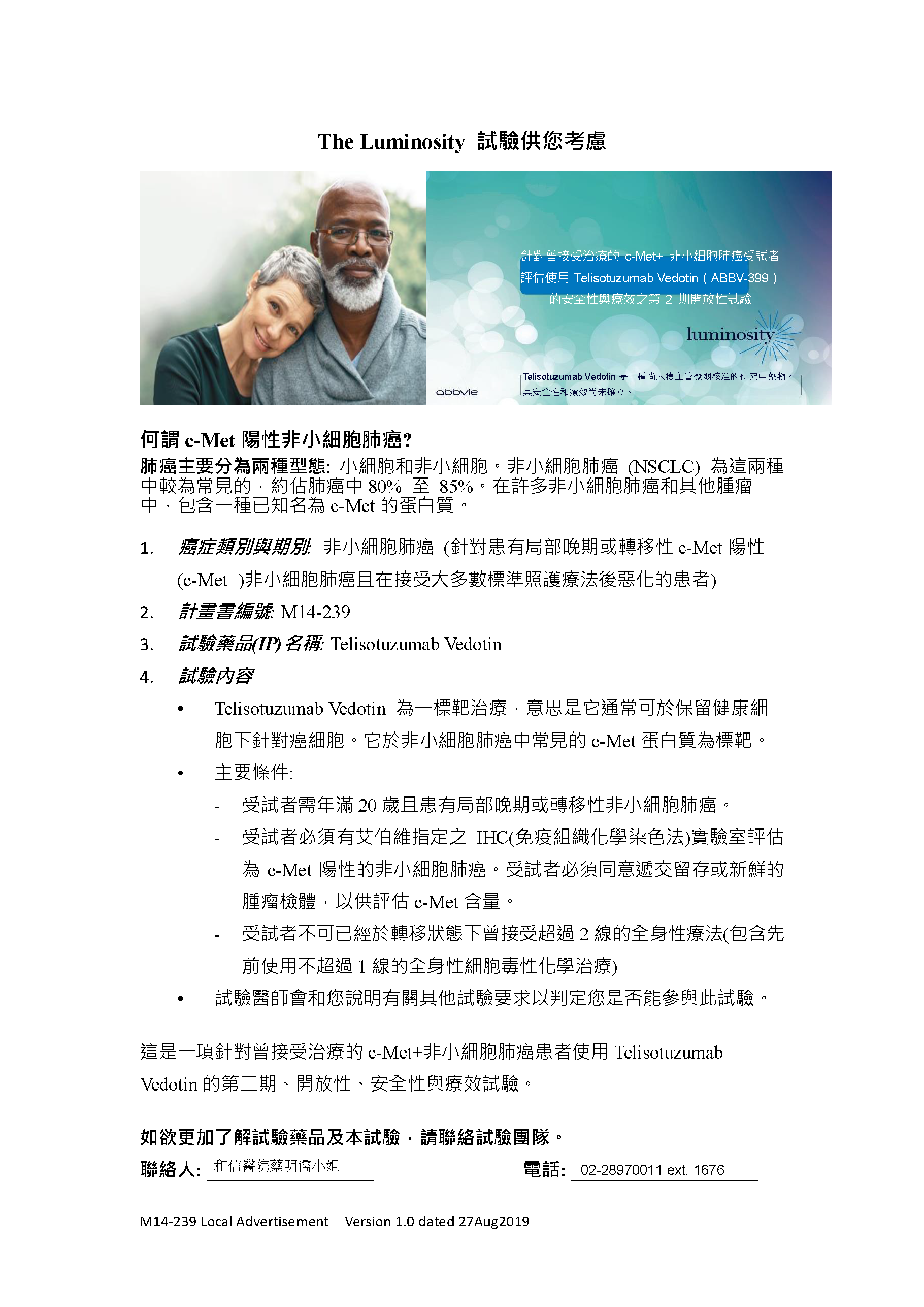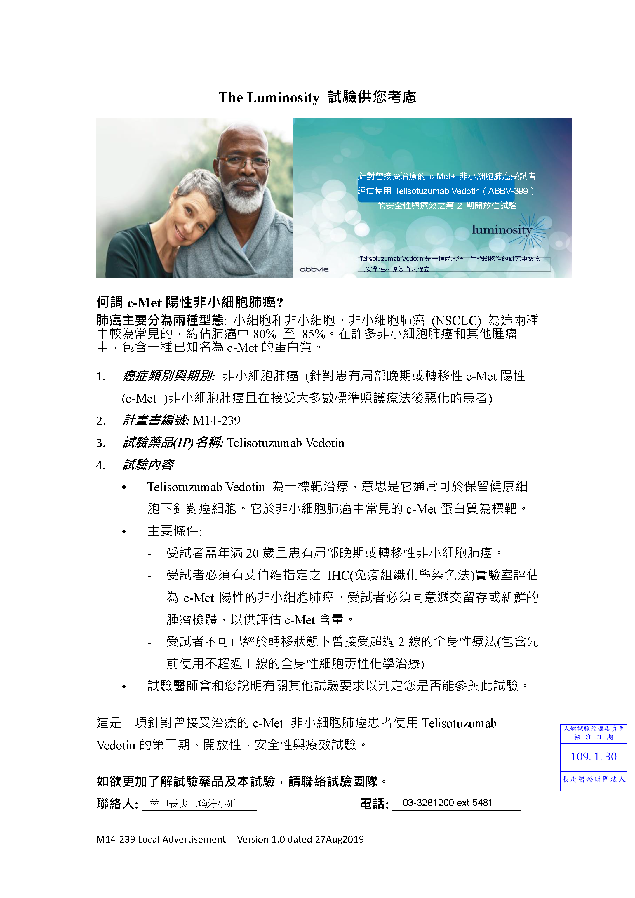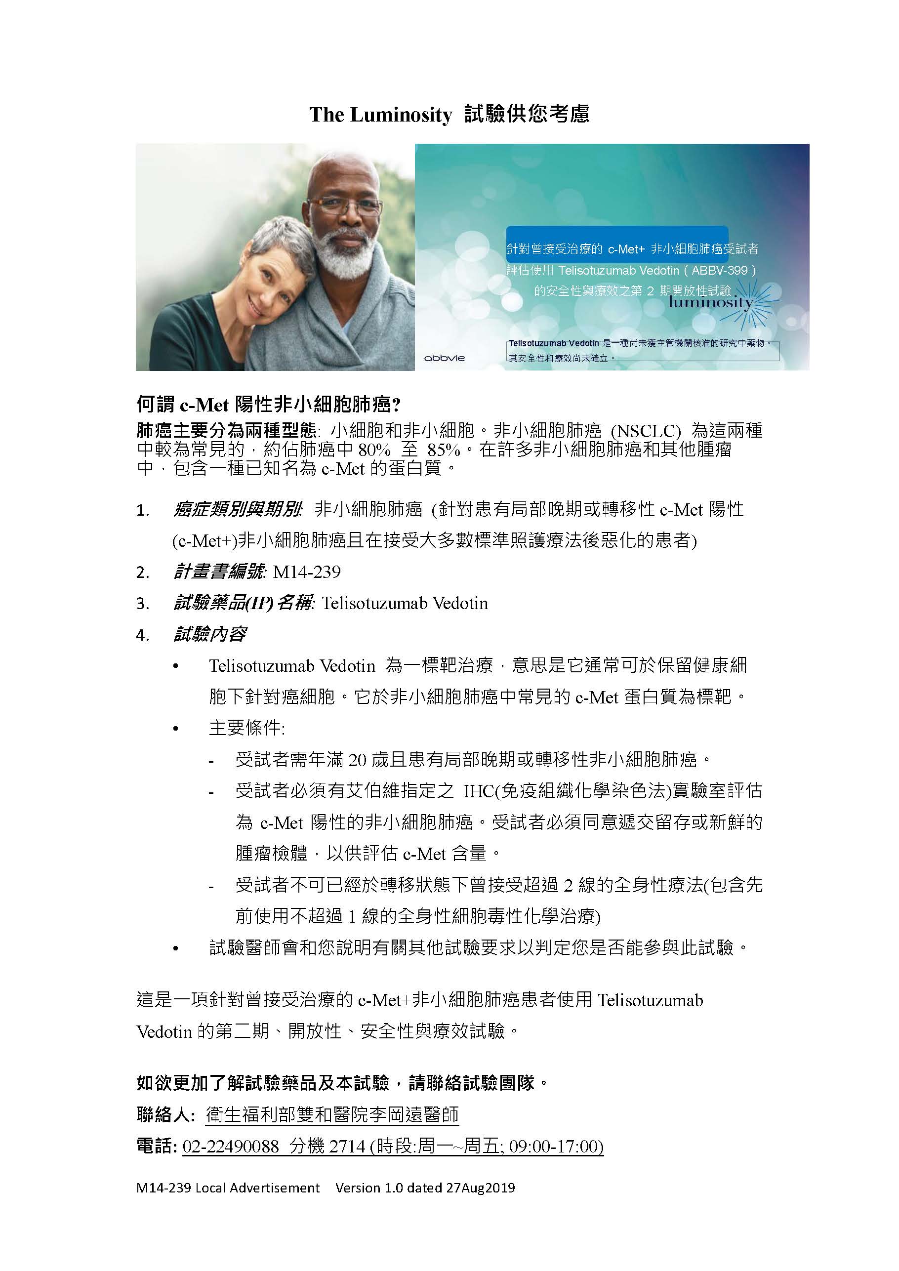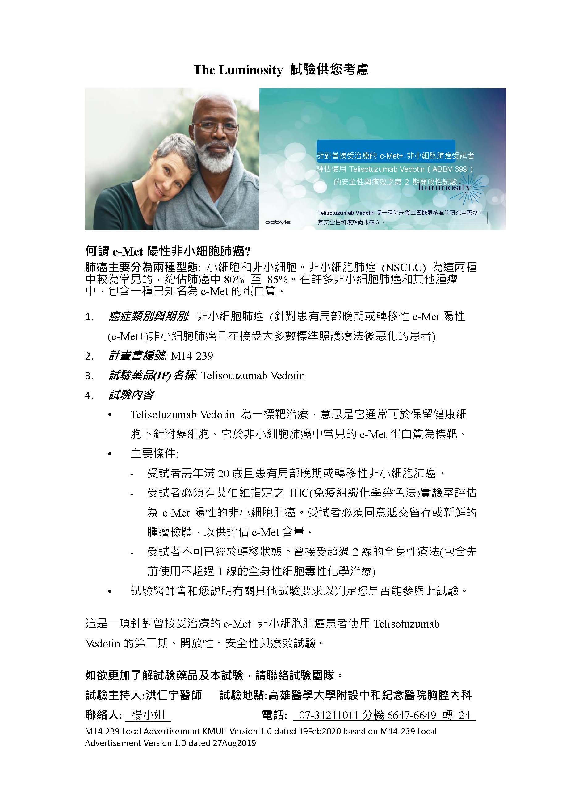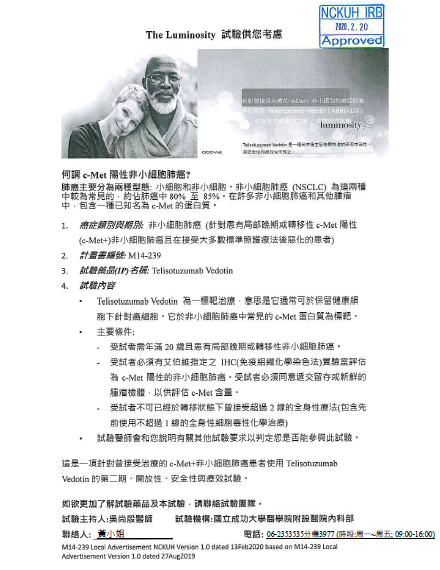針對曾接受治療的c-Met+ 非小細胞肺癌受試者評估使用Telisotuzumab Vedotin (ABBV-399)的安全性與療效之第2期開放性試驗