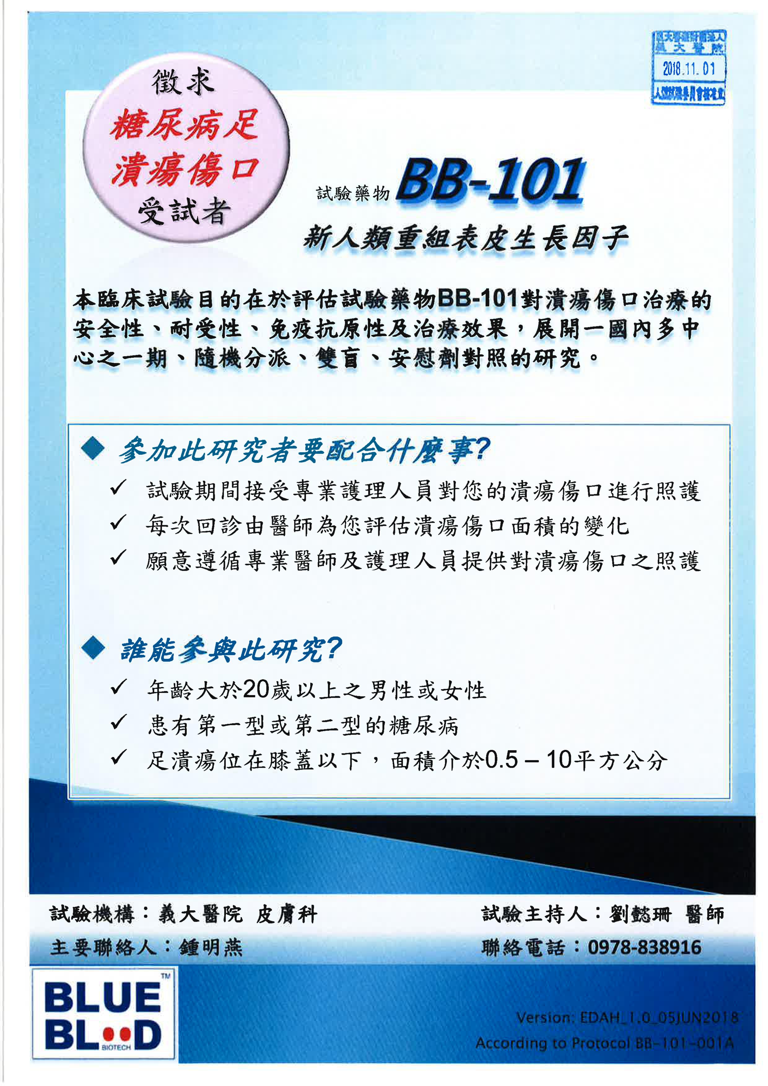 本平台目的為推廣台灣臨床試驗,提供廠商、研究者及一般民眾臨床試驗之相關訊息。