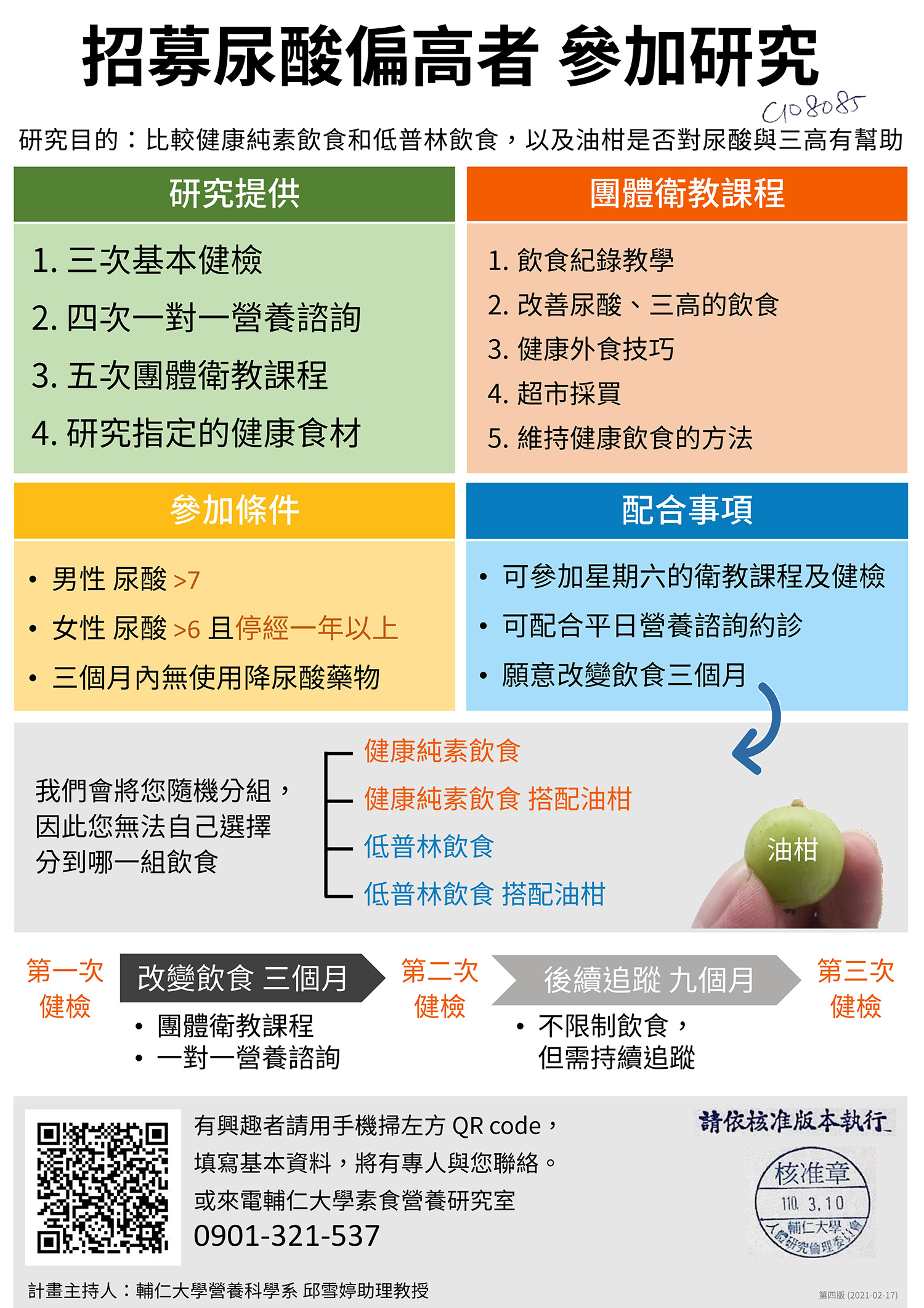 健康純素飲食 vs. 低普林飲食,搭配或不搭配油甘對高尿酸血症及其他心血管代謝危險因子的影響: 2x2多因子隨機臨床試驗