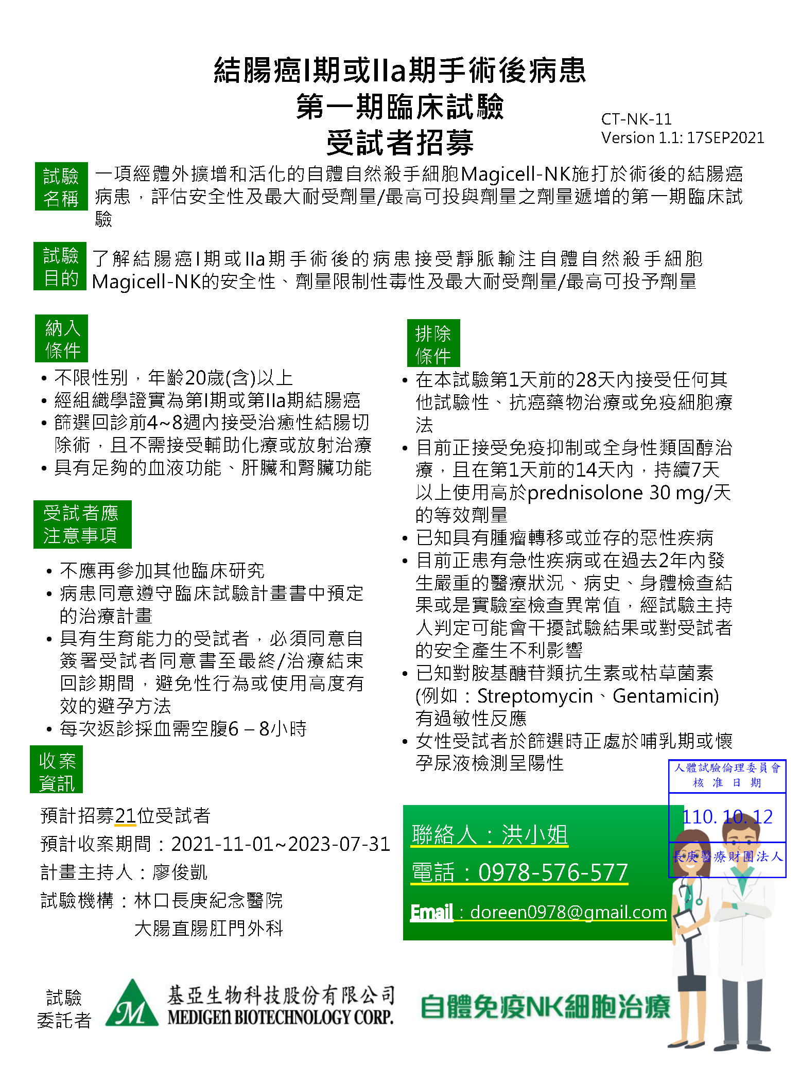 一項經體外增和活化的自體自然殺手細胞Magicell-NK施打於術後的結腸癌病患,評估安全性及最大耐受劑量/最高可投與劑量之劑量遞增的第一期臨床試 驗