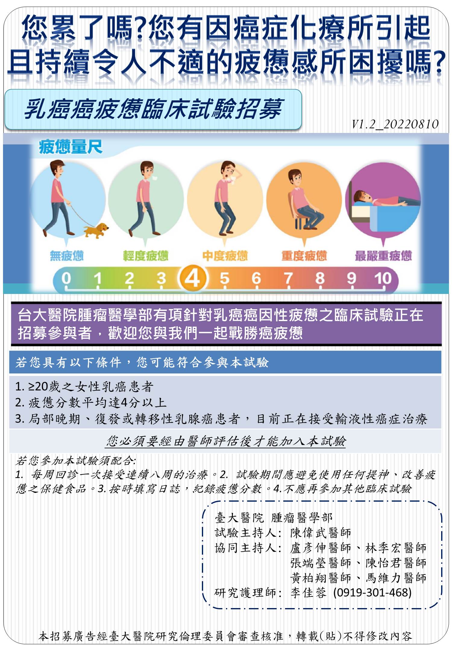 台大醫院腫瘤醫學部有項針對乳癌癌因性疲憊之臨床試驗正在 招募參與者,歡迎您與我們一起戰勝癌疲憊