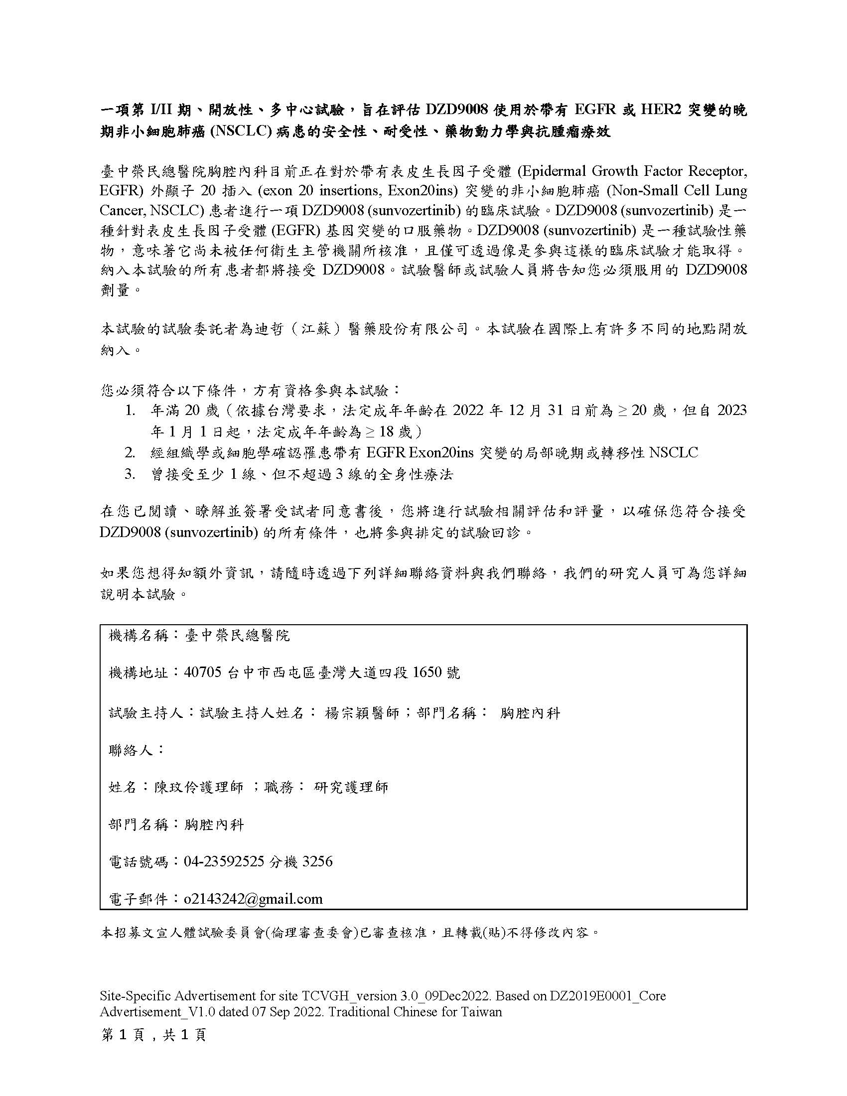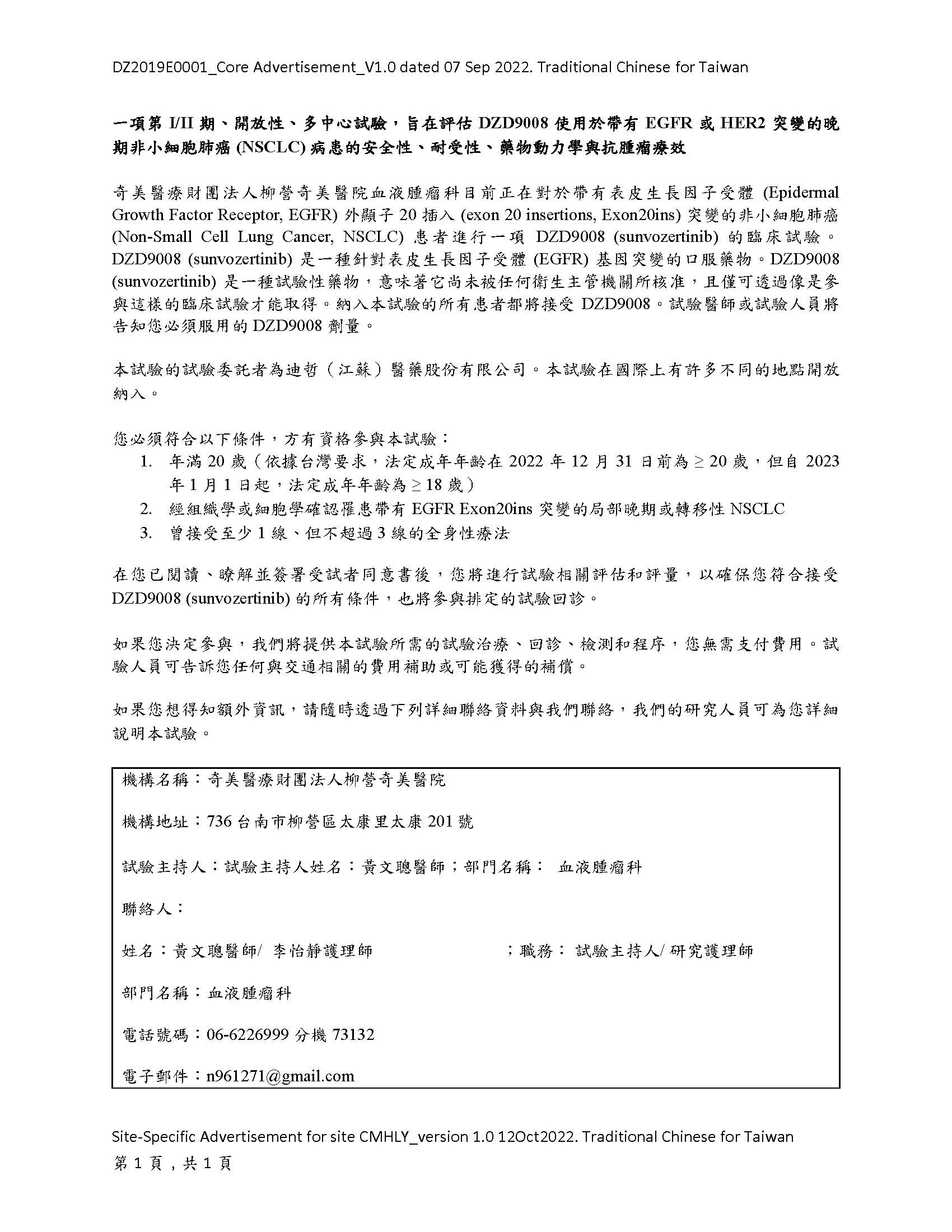 一項第 I/II 期、開放性、多中心試驗,旨在評估DZD9008使用於帶有EGFR或HER2突變的晚期非小細胞肺癌(NSCLC)病患的安全性、耐受性、藥物動力學與抗腫瘤療效