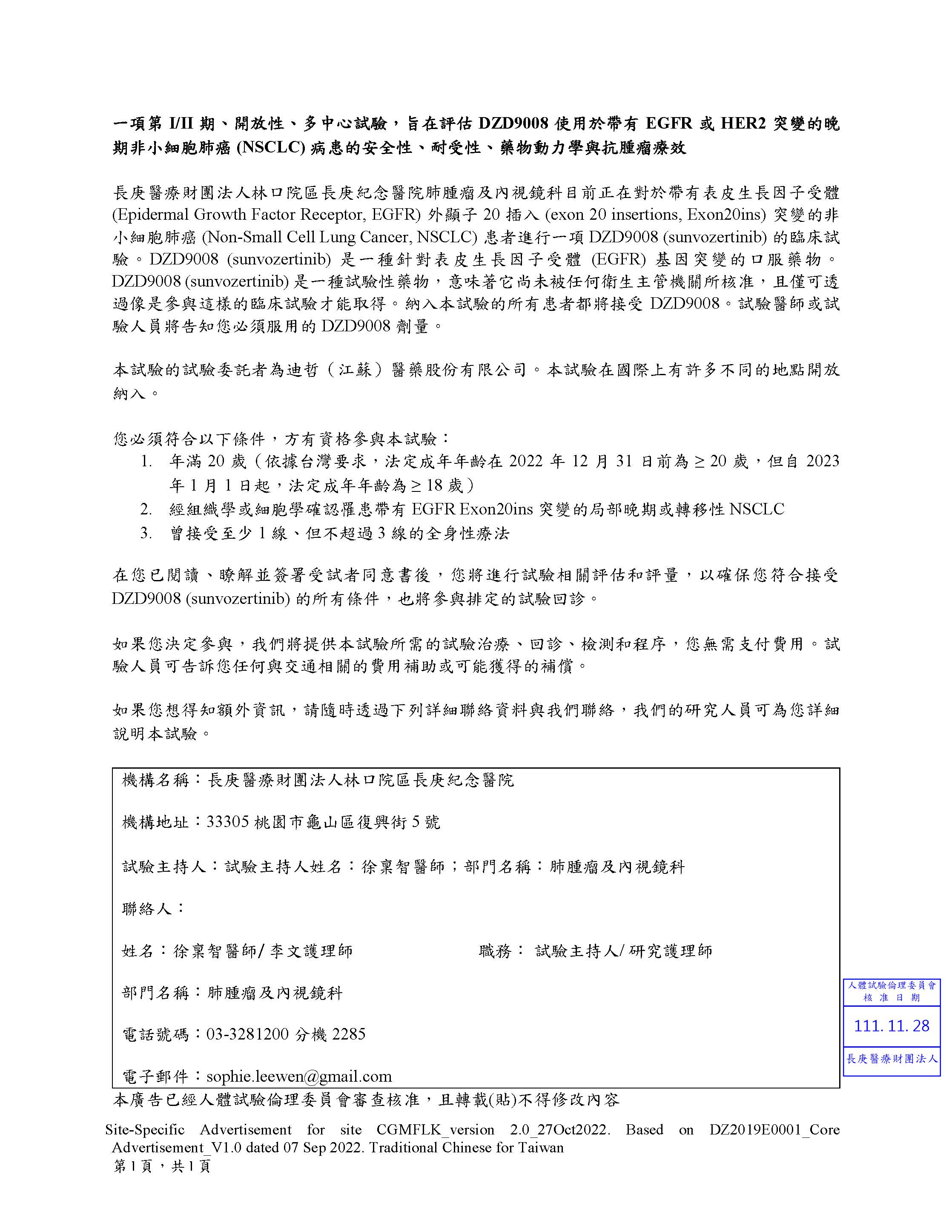 本平台目的為推廣台灣臨床試驗,提供廠商、研究者及一般民眾臨床試驗之相關訊息。 若您需要刊登受試者招募廣告、臨床試驗相關活動或臨床試驗受托機構訊息,歡迎留下您的資料與聯絡方式,我們會儘速跟您連繫。