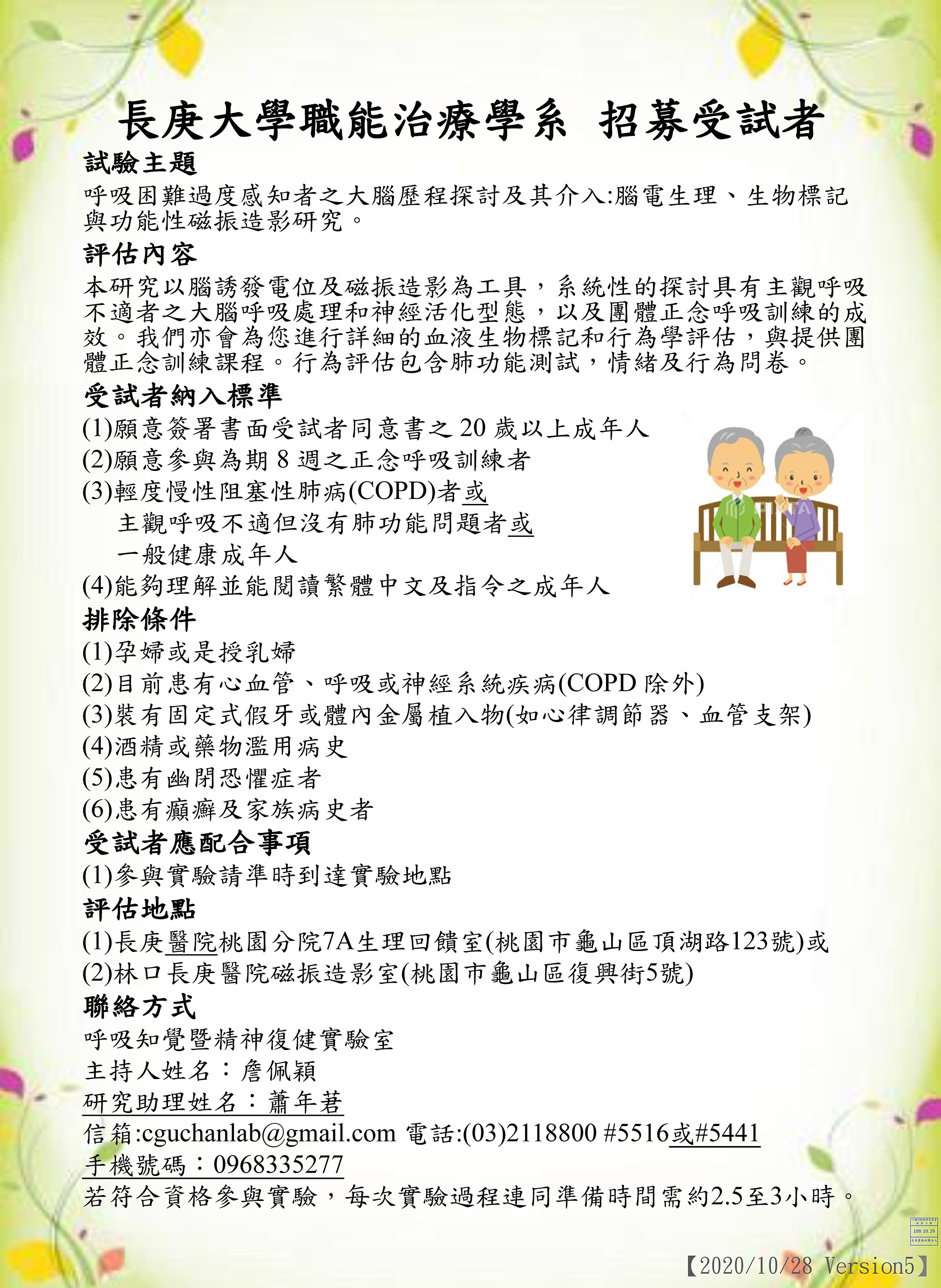 本研究以腦誘發電位及磁振造影為工具,系統性的探討具有主觀呼吸 不適者之大腦呼吸處理和神經活化型態,以及團體正念呼吸訓練的成 效。我們亦會為您進行詳細的血液生物標記和行為學評估,與提供團 體正念訓練課程。行為評估包含肺能測試,情緒及行為問卷。