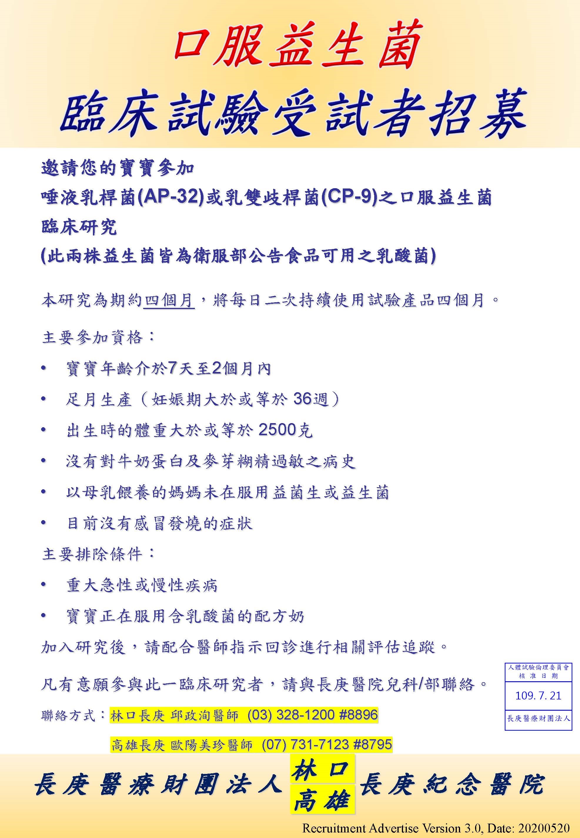 邀請您的寶寶參加,唾液乳桿菌(AP-32)或乳雙歧桿菌(CP-9)之口服益生菌臨床研究 (此兩株益生菌皆為衛服部公告食品可用之乳酸菌)