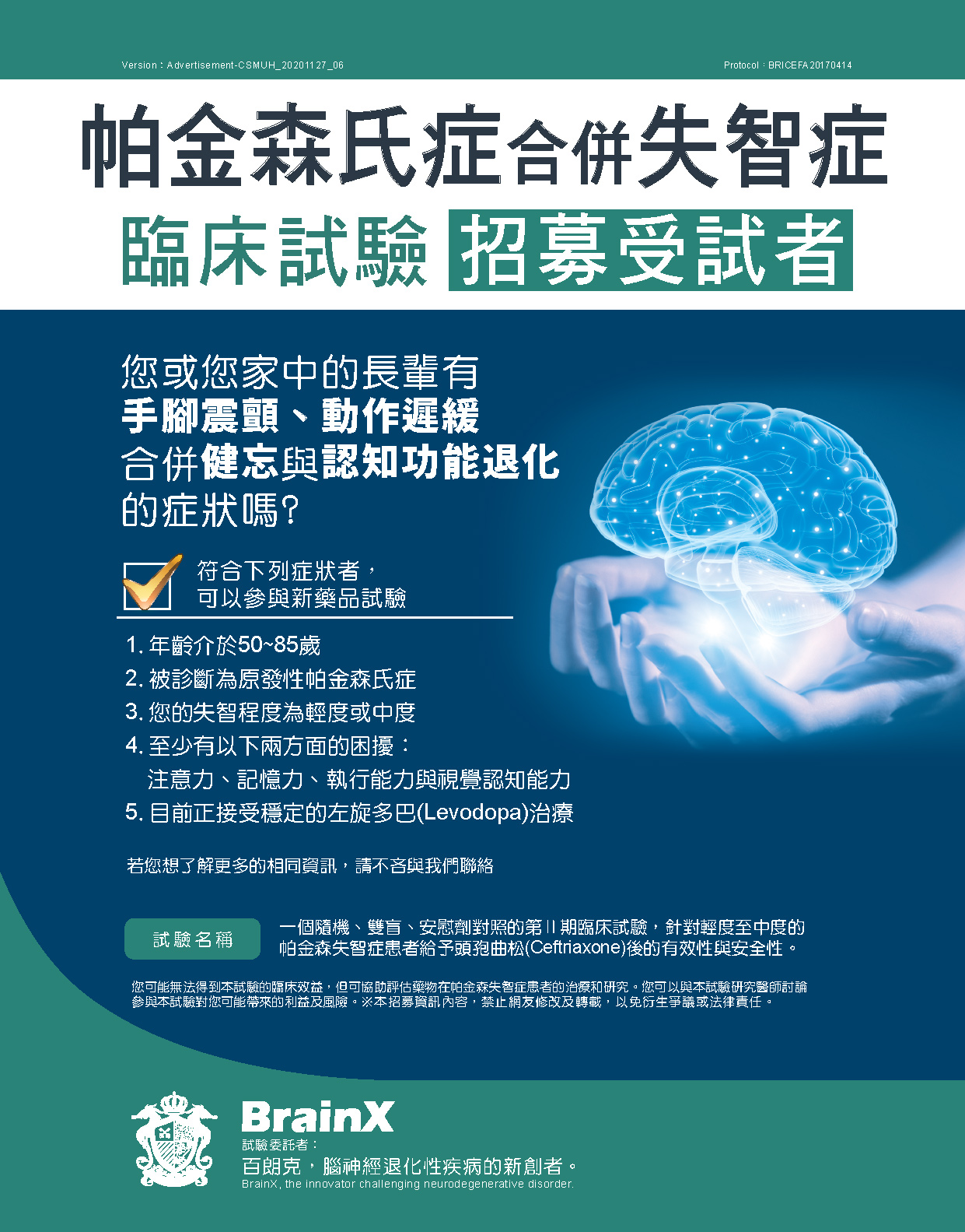 一個隨機、雙盲、安慰劑對照的第Ⅱ期臨床試驗,針對輕度至中度的帕金森失智症患者給予頭孢曲松(ceftriaxone)後的有效性與安全性
