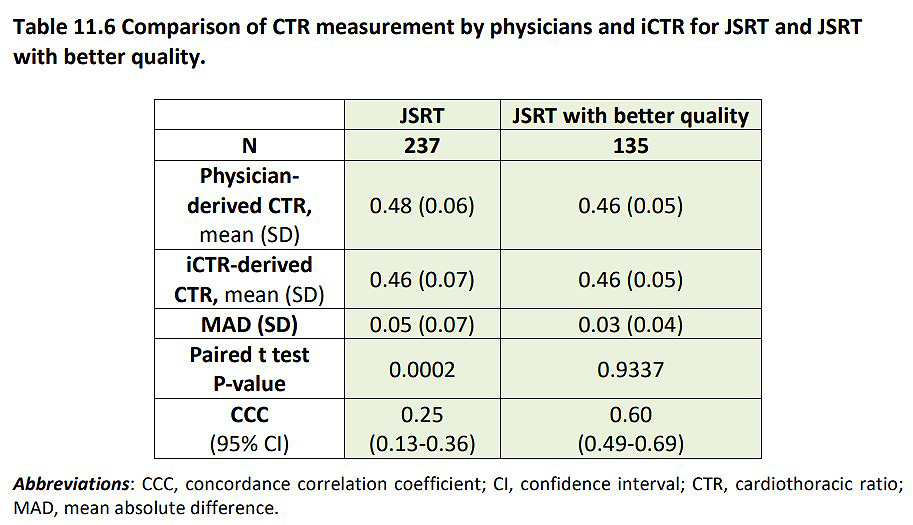 2. 聯盟曾針對本土廠商有一個生醫產業合作案(新醫療器材第二級):智能心胸比估算系統。心胸比 (CTR) 是一種簡便且非侵入性並可檢測心臟大小的工具,常用於檢查心臟肥大。然而,使用胸部X光後前照影像來計算心胸比需要臨床醫生輔助標註,尤其是在影片數量龐大的時候將非常耗時。因此,本試驗計畫主要是驗證使用機器學習的iCTR智能心胸比估算系統在評估心胸比及心臟肥大是否與醫師有相同之準確性。結果iCTR系統估算的CTR值與醫生標註的CTR並無顯著差異。