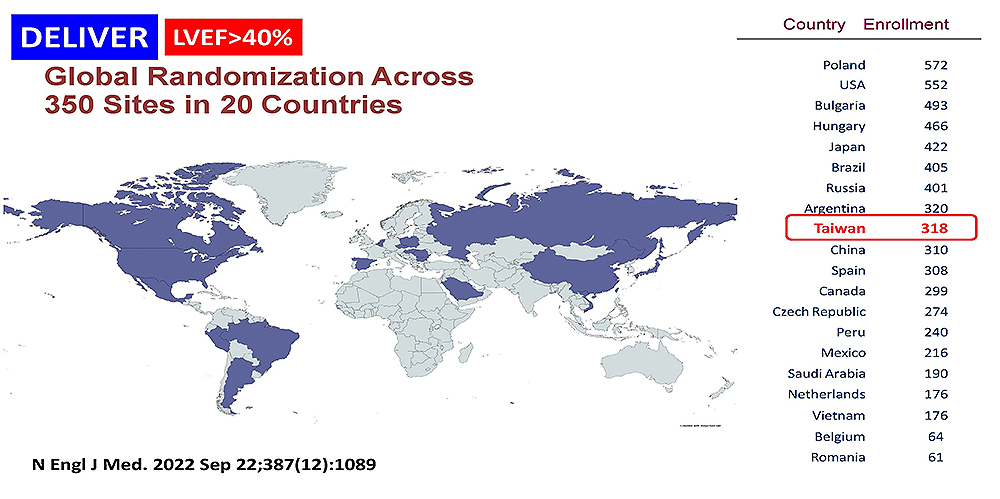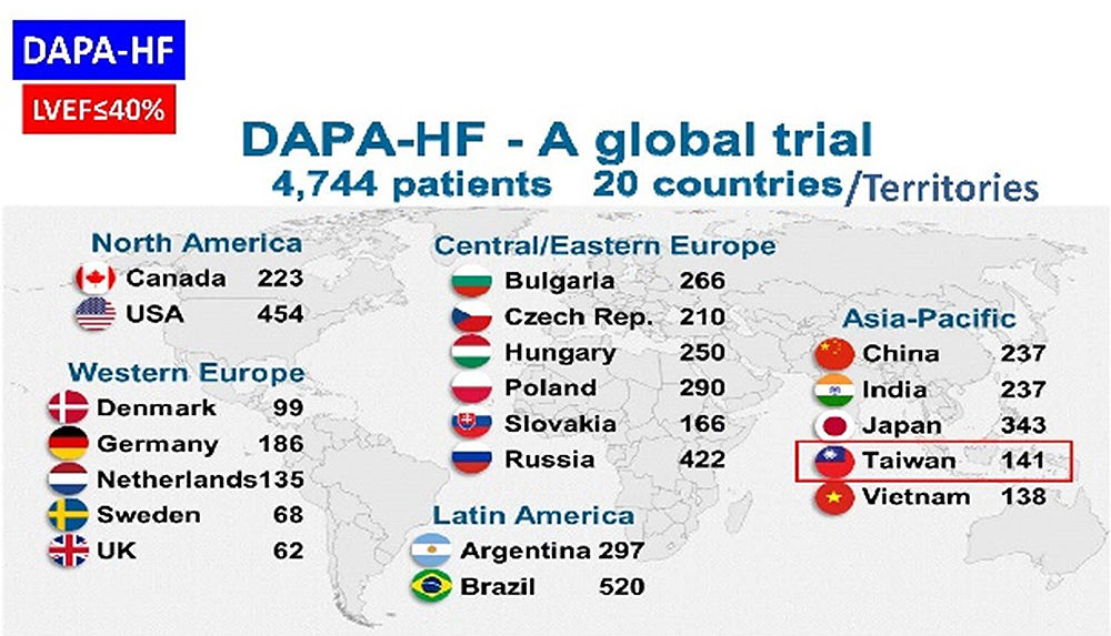 - 臺灣心臟衰竭臨床試驗合作聯盟合作執行DELIVER試驗,結果顯示dapagliflozin能使心臟衰竭病患下降10%死亡率及29%再住院率,歐洲心臟醫學會於2023年08月推出最新心臟衰竭治療指引修正,認同此一決定。