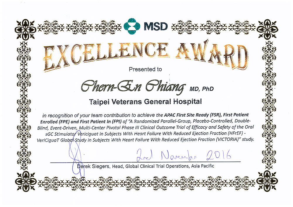 - 協助英國大藥廠,評估低收縮分率之慢性心衰竭病患使用Dapagliflozin在心衰竭惡化或心血管死亡發生率效果的試驗臨床試驗。(臨床試驗Phase III)